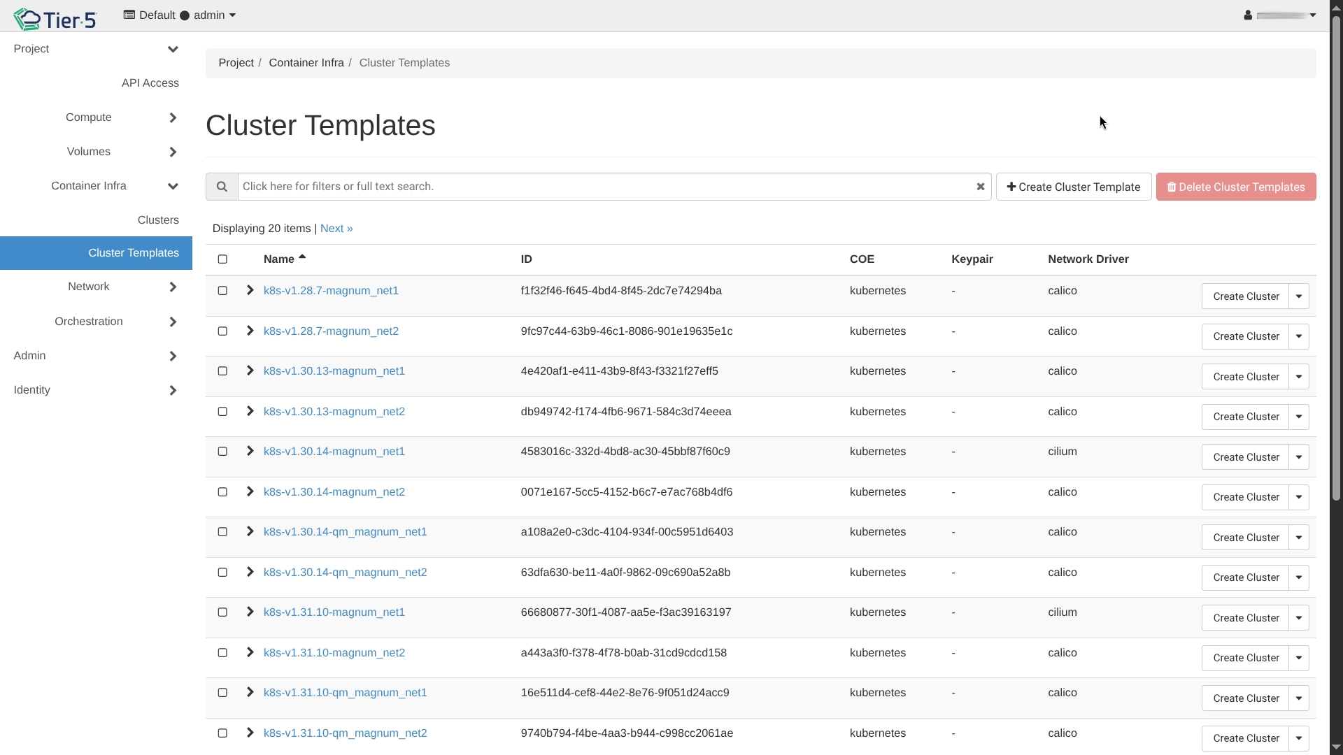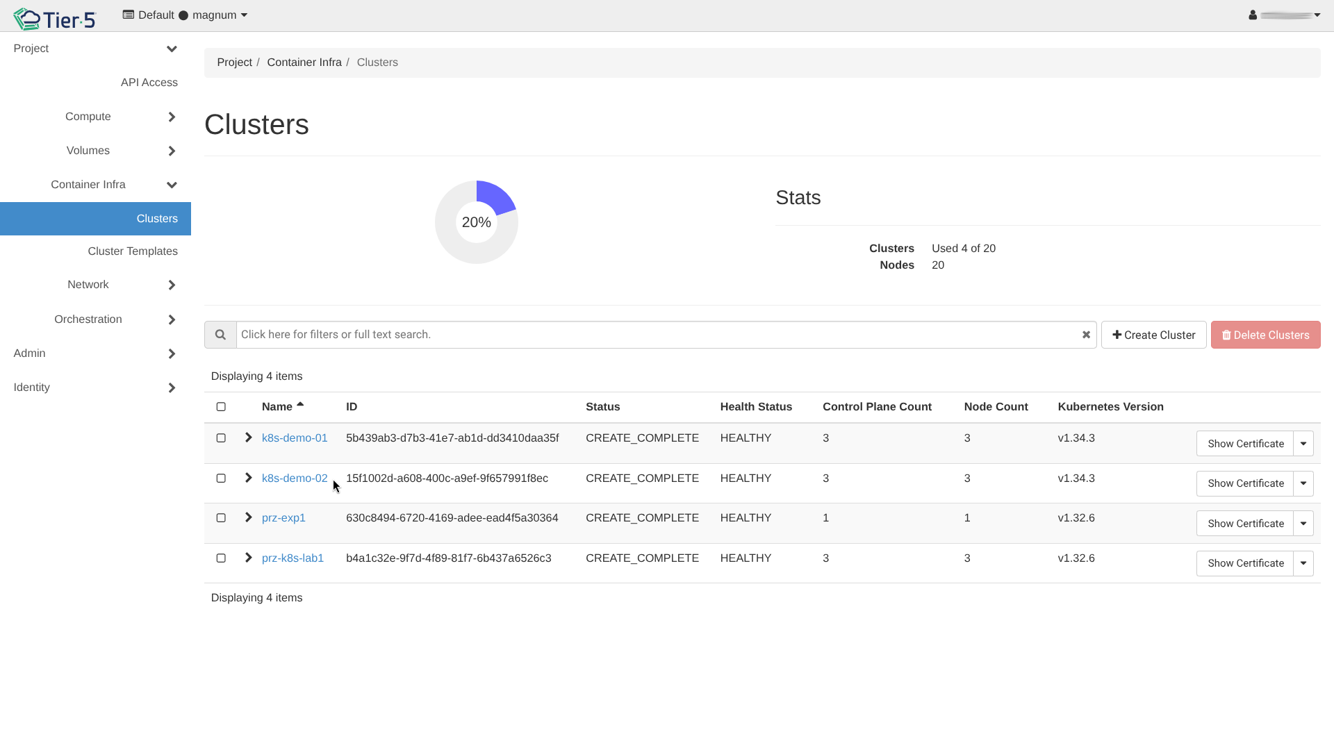 Tier5 allows you to deploy fully managed Kubernetes clusters using Magnum.