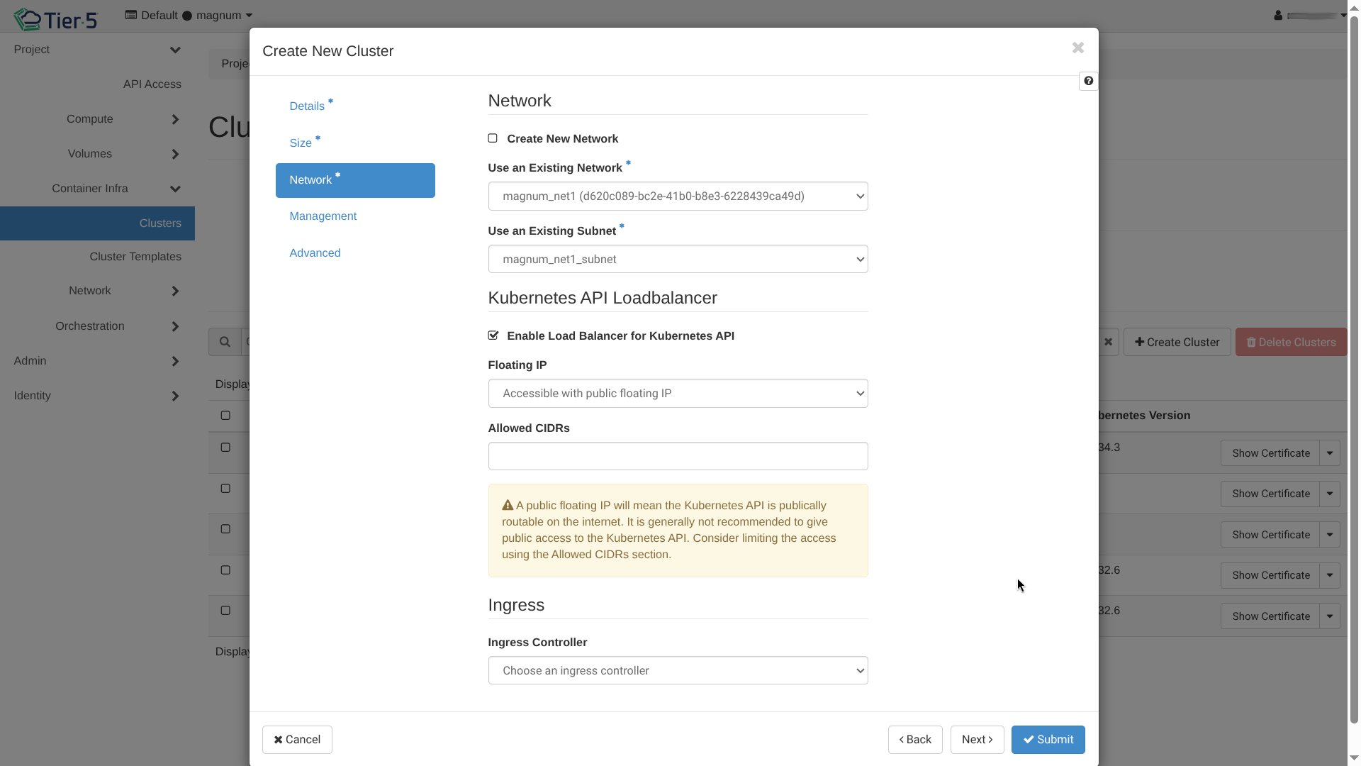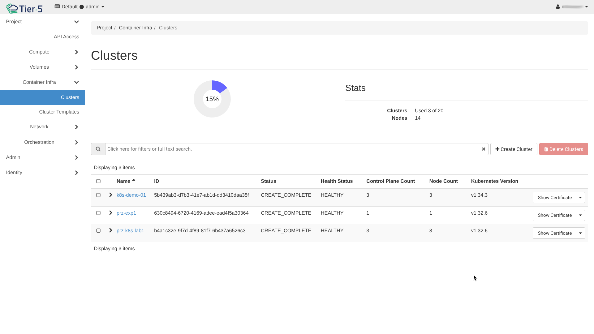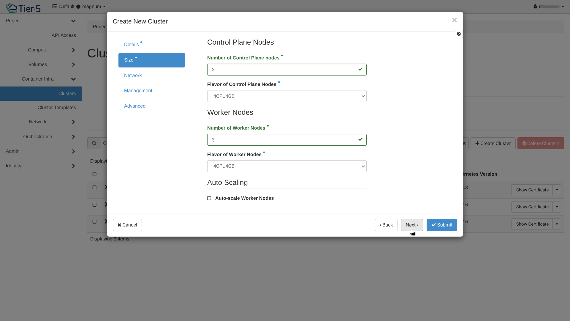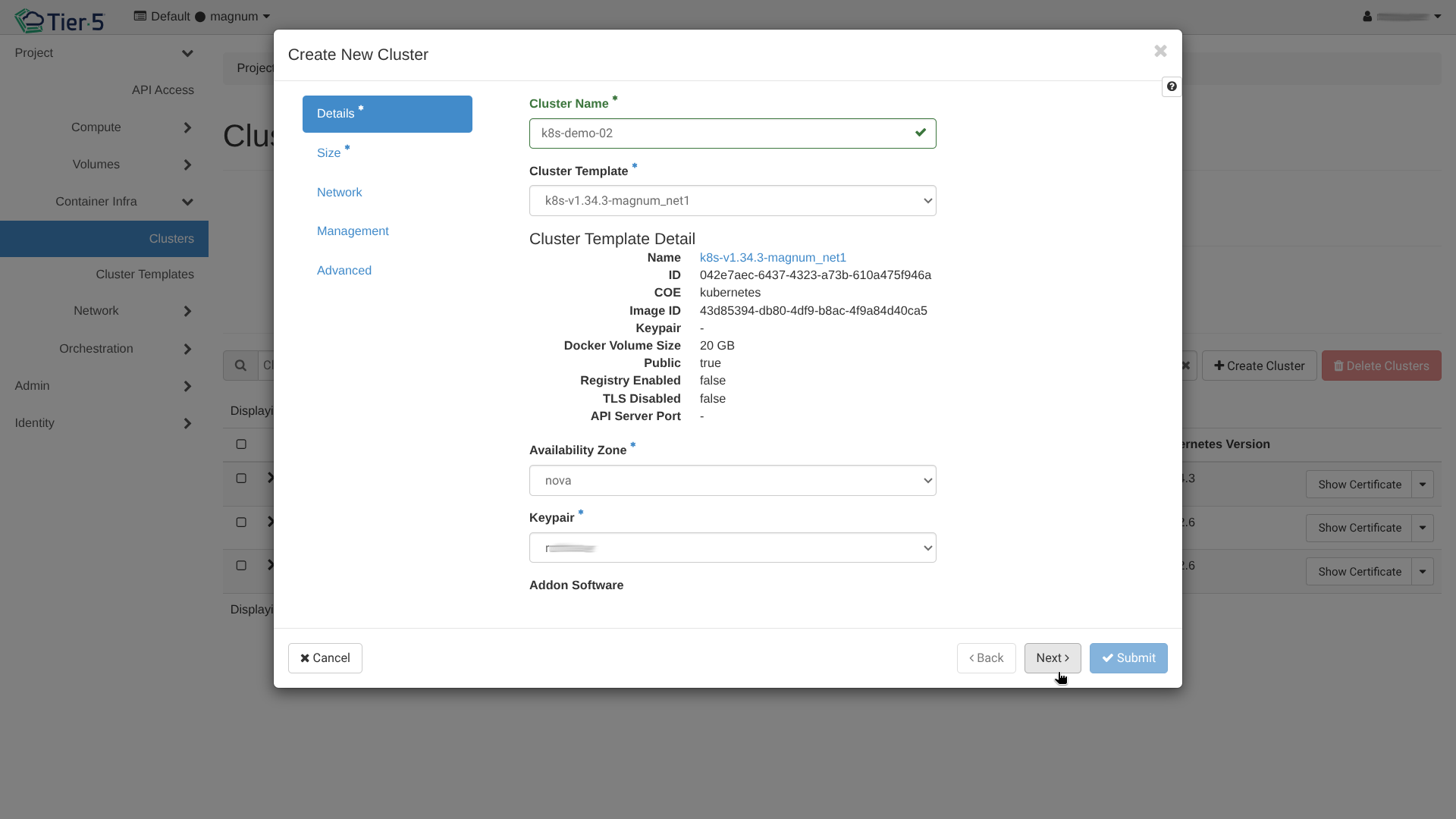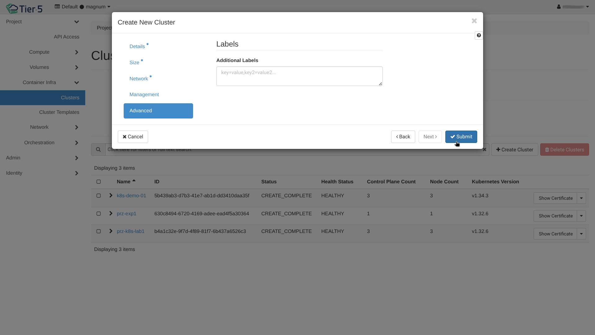 Tier5 allows you to deploy fully managed Kubernetes clusters using Magnum.
