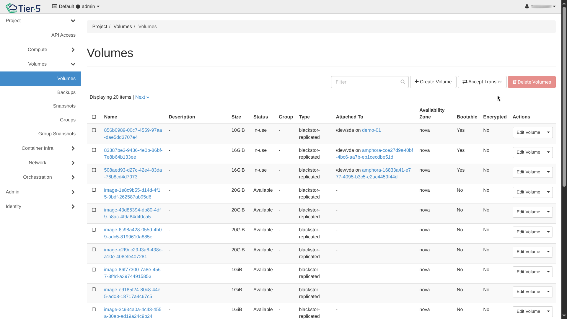 - Once created, use Manage Attachments to connect the volume to a running instance.